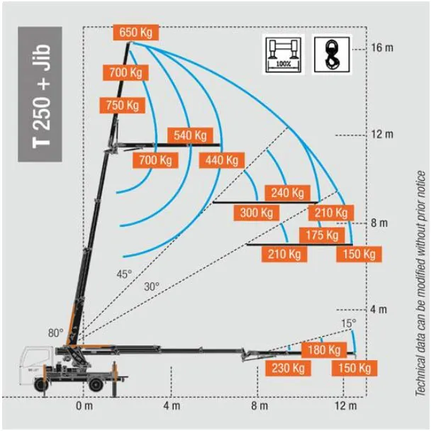 The BG-T250, is equipped with an integrated control system, which enables the crane to automatically adjust the load limiter, to the situation determined by the position of each outrigger.