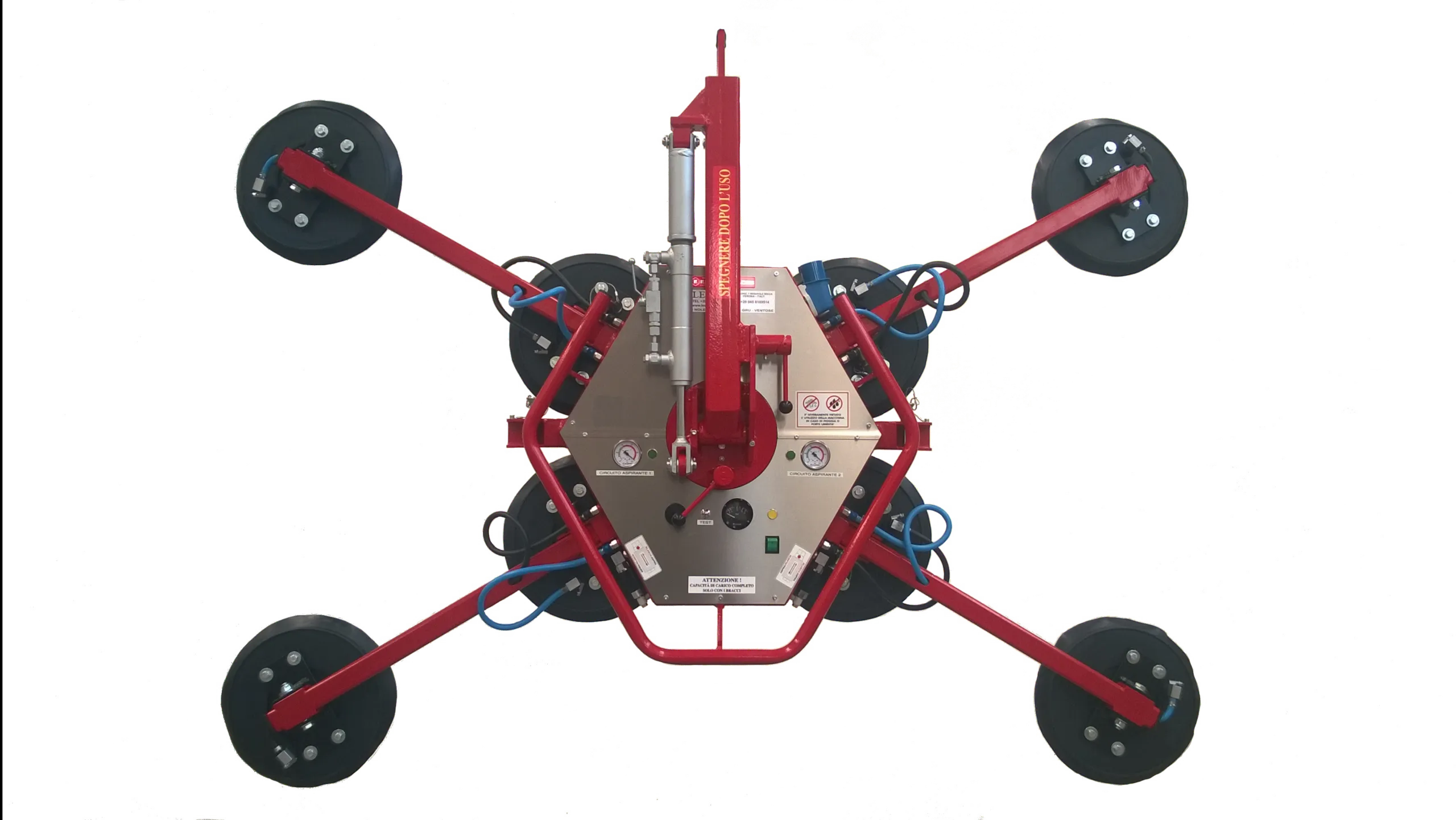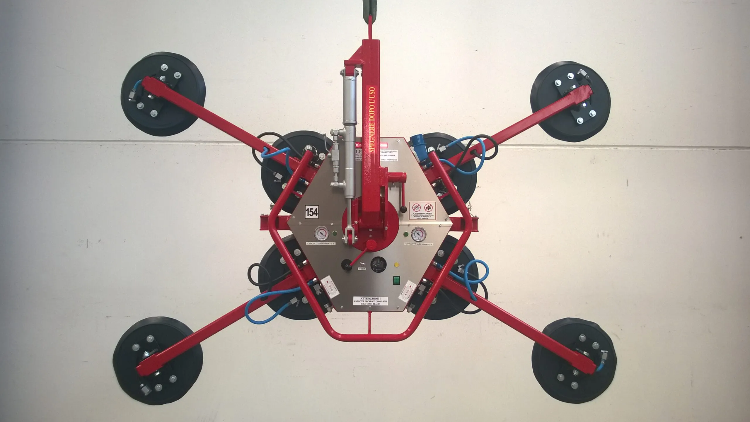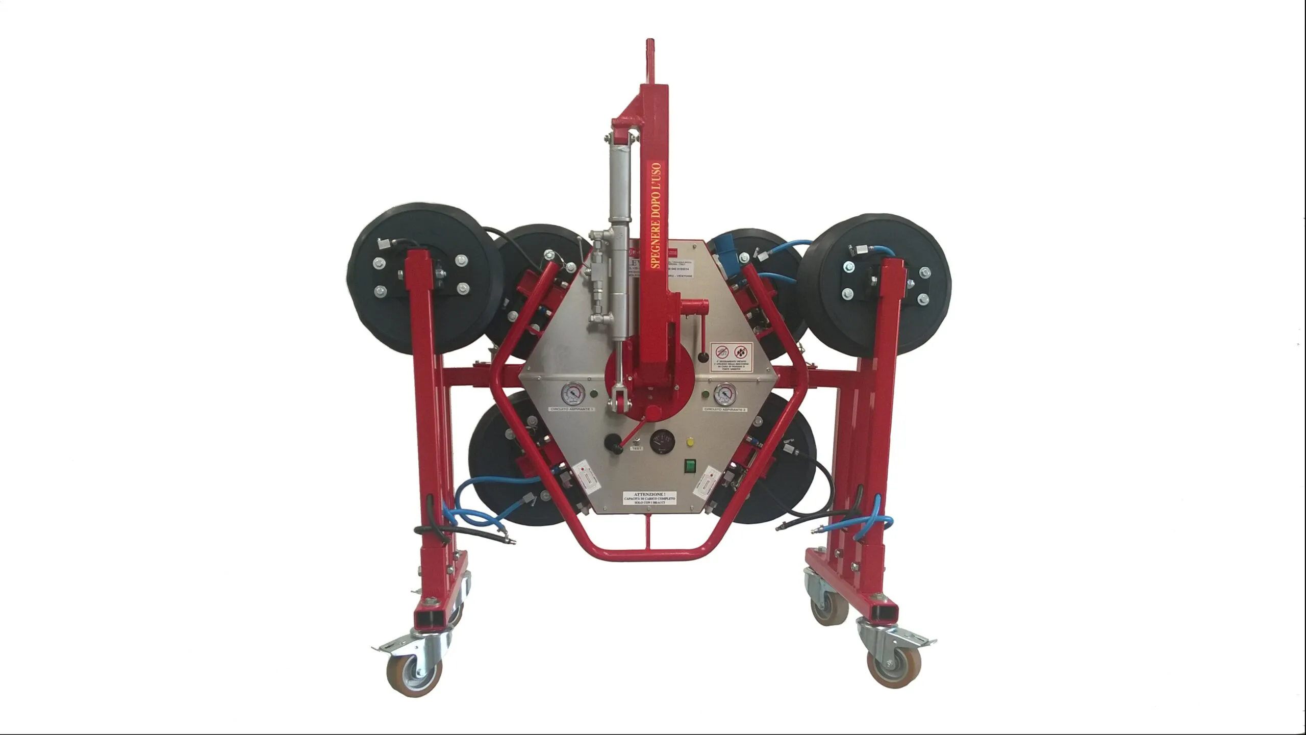 The manual DSKZ2/12V (600Kg) is suitable for handling glass, ceramics, steel and panels; thanks to its small size, it can also be transported in the trunk of the machine; it is equipped with a trolley for easy transport. The attachment is adjustable in three positions for better balancing.