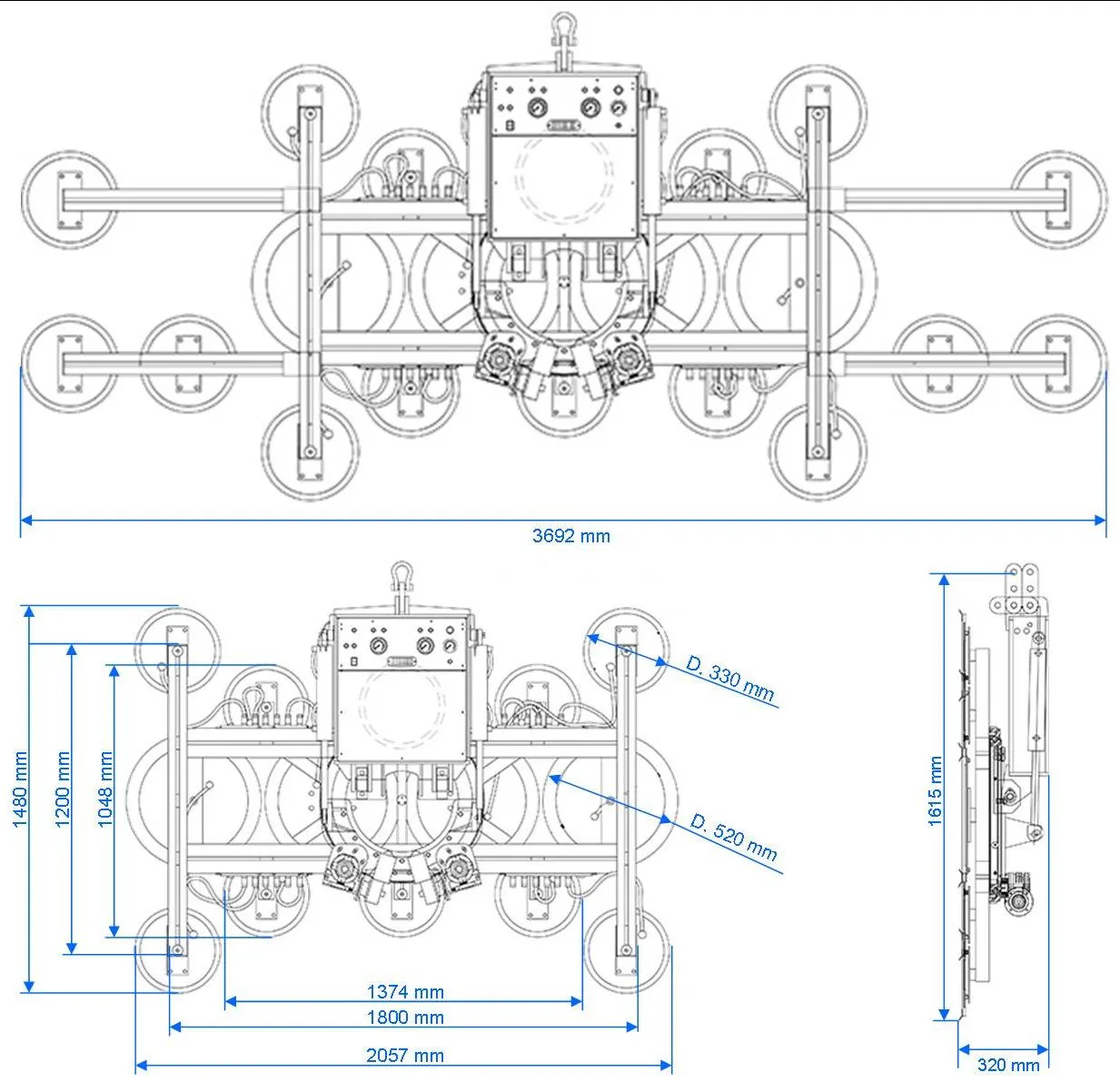 Viene dotata delle nuove patte aspiranti K400, 580 mm di diametro per 200 kg di portata cadauna. Può essere inoltre dotata di estensioni su misura che aumentano la stabilità a carichi molto lunghi.