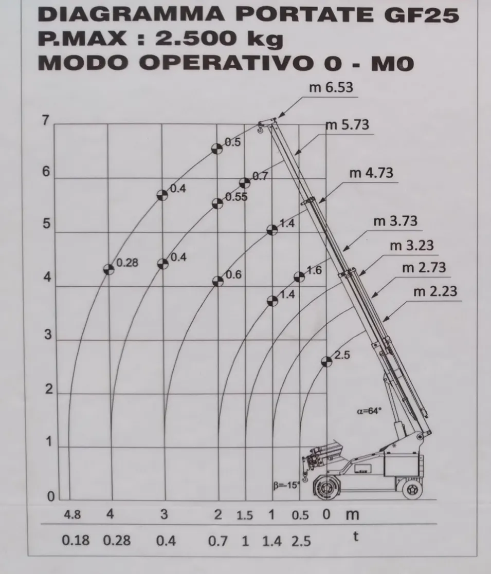 Il sollevatore GF25, può essere dotato anche di un pratico Falcone da 980 mm con portata 800 kg