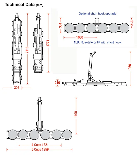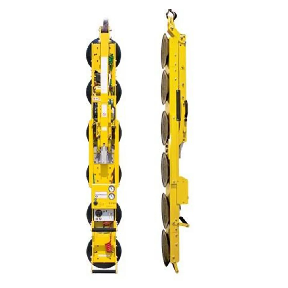 Ideale per il sollevamento di vetrate lunghe in luoghi di lavoro ristretti, il dispositivo di sollevamento a sei piastre, è dotato di rotazione manuale di 180 gradi, bloccabile in tre posizioni e inclinazione di 90 gradi, contribuendo a ridurre lo sforzo di inclinazione di carichi pesanti dalla posizione piatta a quella verticale .