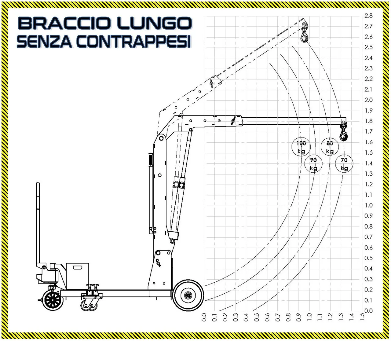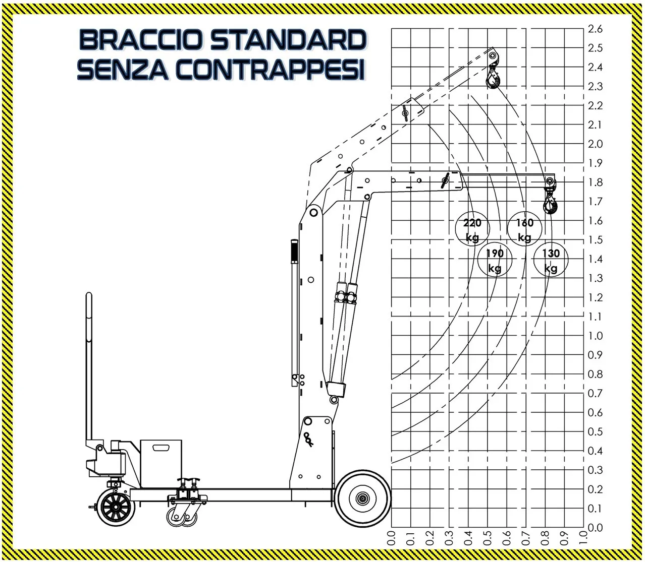La struttura compatta rende semplici sia l’immagazzinamento che il trasporto da un luogo all’altro. Il braccio di sollevamento, estensibile in 4 posizioni, consente la movimentazione di carichi di forme e dimensioni differenti, raggiungendo posizioni malagevoli.