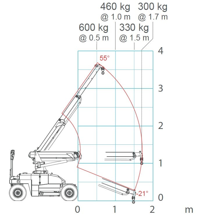 Il braccio telescopico e rotante ( +/- 10°) , ha una capacità di  sollevamento fino a 600 kg (1.323 lb).